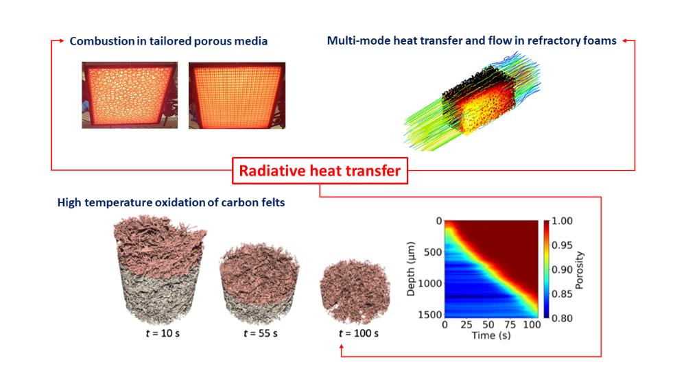 Refractory cellular materials (carbon felts, open-pored ceramic foams, structured ceramics, etc.) are at the heart of strategic development in key industrial sectors, whether for carbon-free energy production or reusable spacecraft. Their high specific surface area, high strength-to-weight ratio, good flow-mixing capacity, high thermal shock resistance, and high resistance to chemical corrosion enable the design of lightweight, compact, high-temperature heat conversion, transport, and storage systems. In order to optimise their overall performance, it is necessary to have a precise understanding of the spatial distribution of heat within their volume, which requires taking into account all modes of heat transport, including radiative transfers. In terms of radiation, cellular refractory materials are semi-transparent media in which the interaction between thermal radiation and matter is reflected by light scattering, absorption and emission. Mathematically, these physical phenomena are described by the integro-differential equation of radiative transfer. If, in addition, fluids, which are themselves semi-transparent, penetrate the cellular support materials, the problem becomes even more complex given the coupling and non-linearity. Modelling the transport of fluids (gas, plasma) through these materials, which may themselves be semi-transparent, adds an extra degree of complexity. This mini-symposium will provide an opportunity to review the experimental and numerical approaches that are currently the focus of attention: topological optimisation, whether AI-driven or not, performance of architectures obtained through additive manufacturing, management of thermal couplings at local or continuous scale, numerical methods for solving transport equations, and development of experimental set-up for characterising high-temperature effective thermophysical quantities and depicting the 3D architectures.